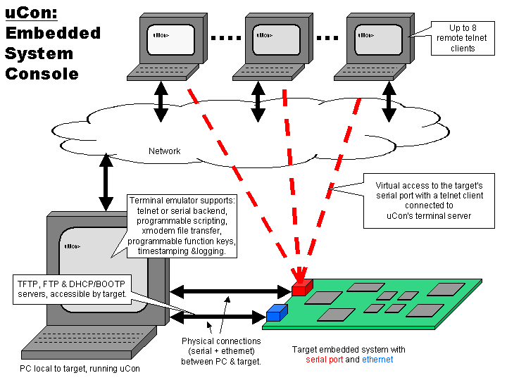 uCon is a tool designed primarily for (but not limited to) embedded system firmware development. It provides typical terminal emulator capabilities; plus a terminal server, and most of the servers applicable to embedded systems development. The original motivation behind development of uCon was to provide multi-user remote access to a PC's serial port, and not eliminate the ability for the local user of the machine running uCon to also have access to that port. As a result, the intended configuration for uCon is to be running on a networked PC whose COM port is tied to the CLI (command line interface) port of some target system.