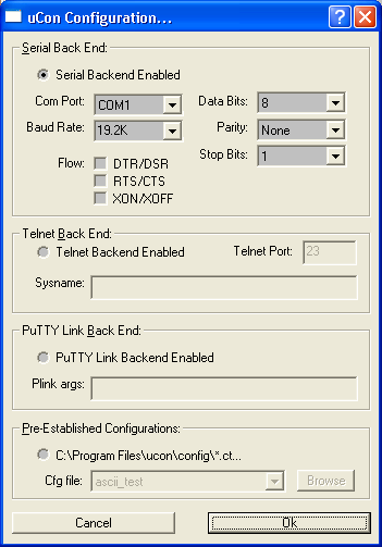uCon can be started up with one of three different back-ends, serial (PC's COM port), telnet (TCP/IP) or PuTTY Link (plink). Using one of the four radio-buttons (note that only one can be active at any given time), the user simply selects the type of backend, or uses a pre-existent configuration file.