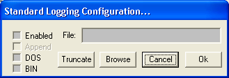 Standard logging can be enabled and disabled through the above dialog box, through the toolbar, or through the script command LOG. The typical use of standard logging is for transferring a small block of interaction at the console window to a file. The dialog box (above) allows the user to specify the file into which the logging data will be placed, and if the file already exists, it can be appended to if the "append" check box is checked. The "truncate" button in this dialog allows the user to purge the content of the logging file at any time. The "DOS" check box tells uCon to make the log file "notepad friendly".