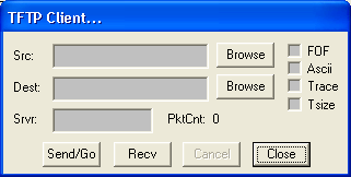 The dialog box requires that the user specify the source and destination file as well as the IP address of the server. By default, the file is transferred in BINARY mode; check the Ascii check box to transfer in ASCII mode. The default TFTP port number (69) is used; however, if the server IP address is immediately followed (i.e. no whitespace) by a colon and a number, then that number will be used as the port instead of 69.