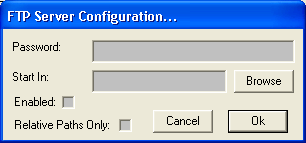 uCon's FTP server supports a superset of the "minimum implementation" discussed in RFC 959. The menu item Servers->FTP brings up the following dialog box: