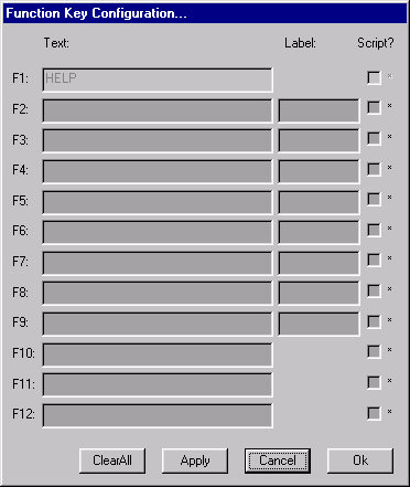The content of the "Label" box is placed in the corresponding function key label on the main window to provide the user with a brief reminder of what is in the function key. Note that not all 12 keys have label boxes, this is because of the limited space used to display the function key labels on the main window.
