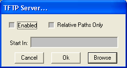 A simple TFTP server can be started to support target-based network bootup and general file transfer. The server is single threaded; hence, it's internal state machine is only prepared to deal with one file transfer at a time. The menu item Servers->TFTP brings up the following dialog box: