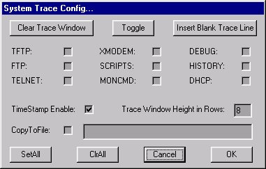 The content of the system trace window can be copied to a file. Each time the CopyToFile box transitions from unchecked to checked, the filename specified in the edit box is truncated and a new log is started.