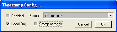 It can be enabled by checking the "enabled" button in this dialog, or through the toolbar button. Since uCon allows remote users to be connected to the session, the timestamping can be put in "local-only" mode so that the time stamp is not transmitted back to each remote client connection.