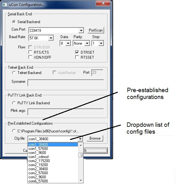 In the shortcut properties box shown above (W7 example), the path of the uCon executable is followed by the name of the config file you want to automatically start up with.